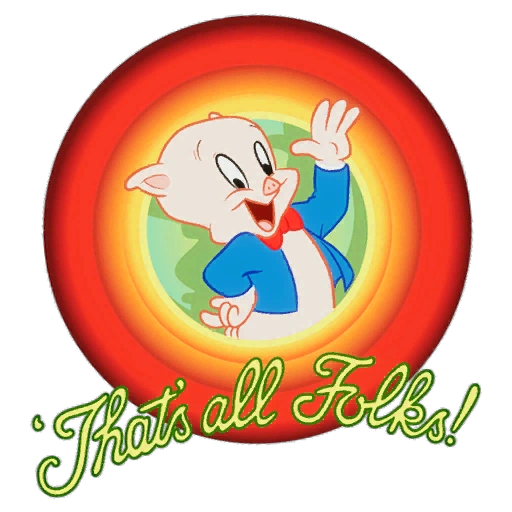"That's All Folks!" is the iconic closing sequence of most Looney Tunes animated shorts, cartoons, and movies. It was first used by Bosko in "Sinkin' in the Bathtub", and later by Buddy and Beans too, before being inherited by Porky Pig as his signature line.